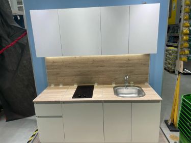 Соберём каркасы, навесим шкафы, дверцы и фурнитуру. Всё отрегулируем. Установим, мойку с сифоном и смесителем.
